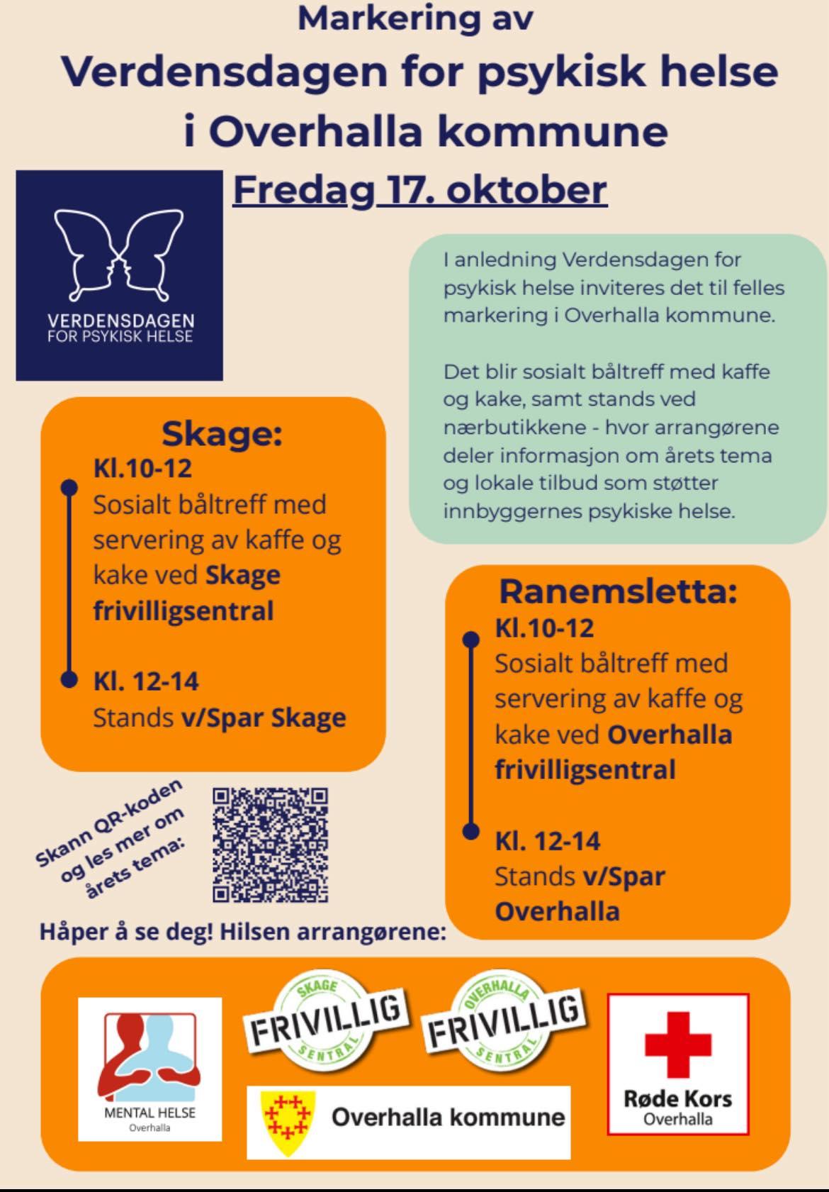 Sosialt båltreff med kaffe og kake kl 10-12 på Overhalla Frivilligsentral og Skage Frivilligsentral. Stands ved Spar Skage og Spar Overhalla kl 12-14. Velkommen!